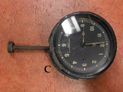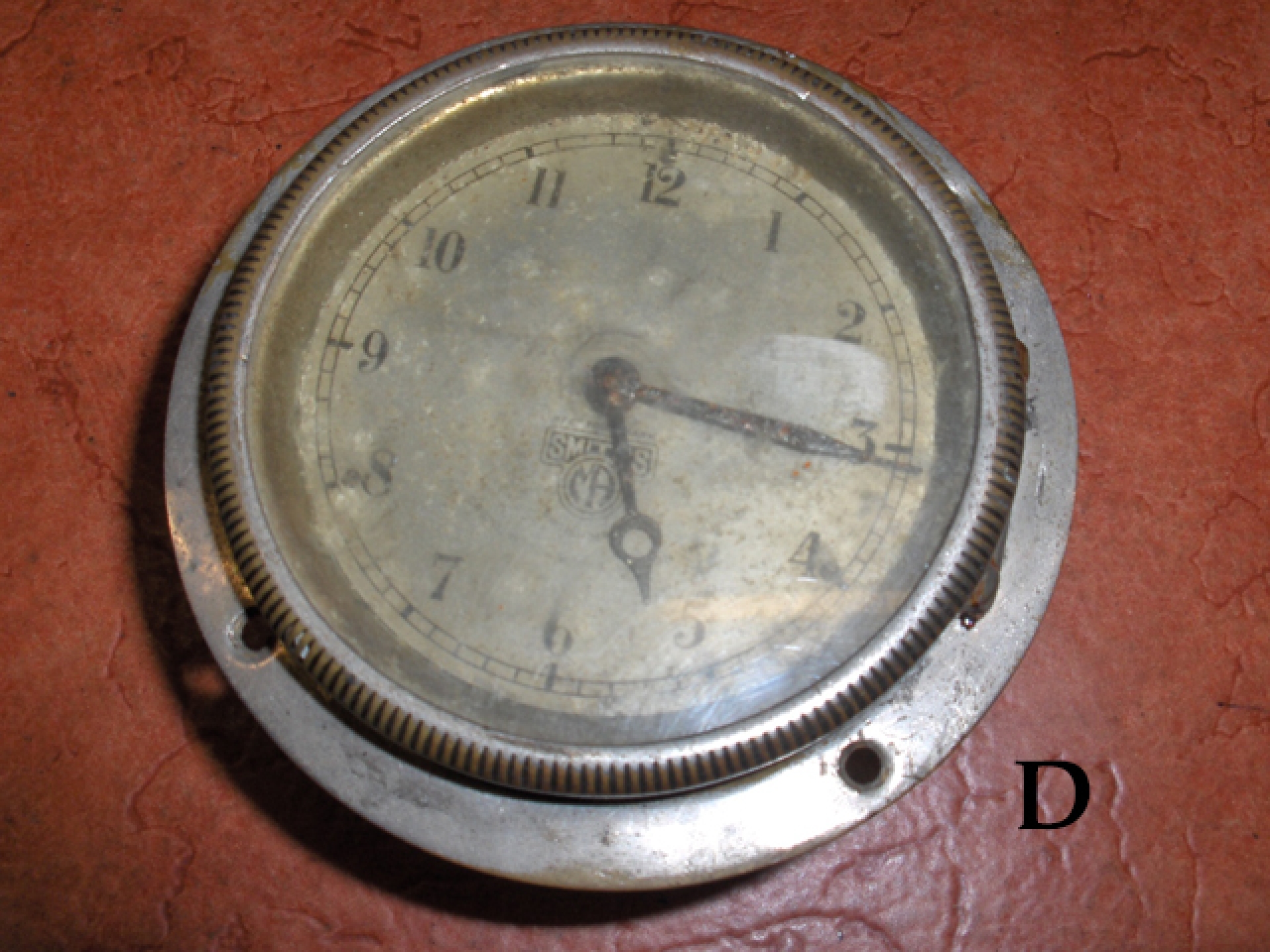 (See the image for the letters) C = Clock for a Prewar Rolls-Royce; intersection90 mm, is in non-working order. Asking price € 300.00. D = Smiths clock for several Prewar models, especially for in the rear of the car; intersection 85 mm, is in non-working order. Asking price € 250.00.