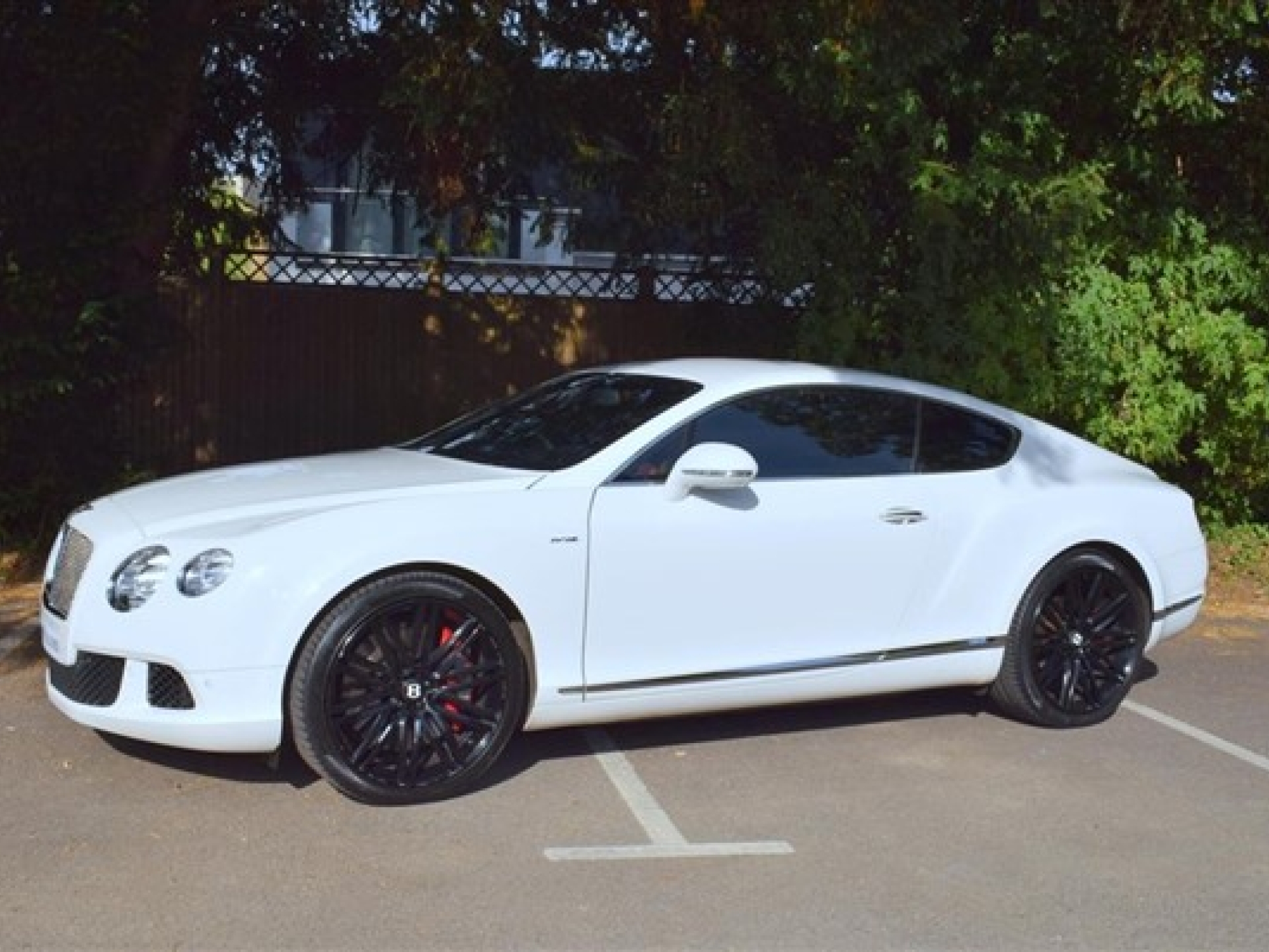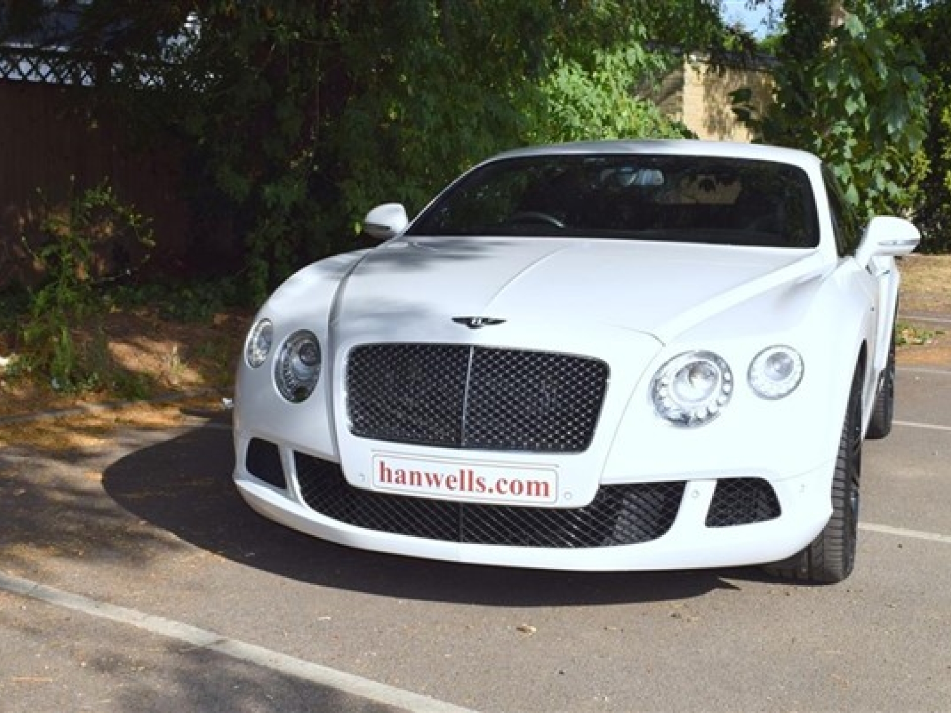 2013/13 Bentley Continental GT Speed. Finished in Glacier White with Black 21 inch Speed wheels with red brake calipers. The interior is trimmed in Beluga hide with Pillar Box Red stitching, with 3 spoke steering wheel in Beluga, stitched in red and Flying B’s on the seats. Massage and ventilated front seats and rear park camera.